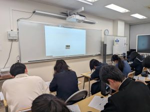 03月03日(高1) の授業内容です。今日は『数学Ⅱ・図形と方程式』の “円と直線の位置関係”、“円上の点における接線の方程式”、“円外の点から引いた接線の方程式” を中心に進めました。